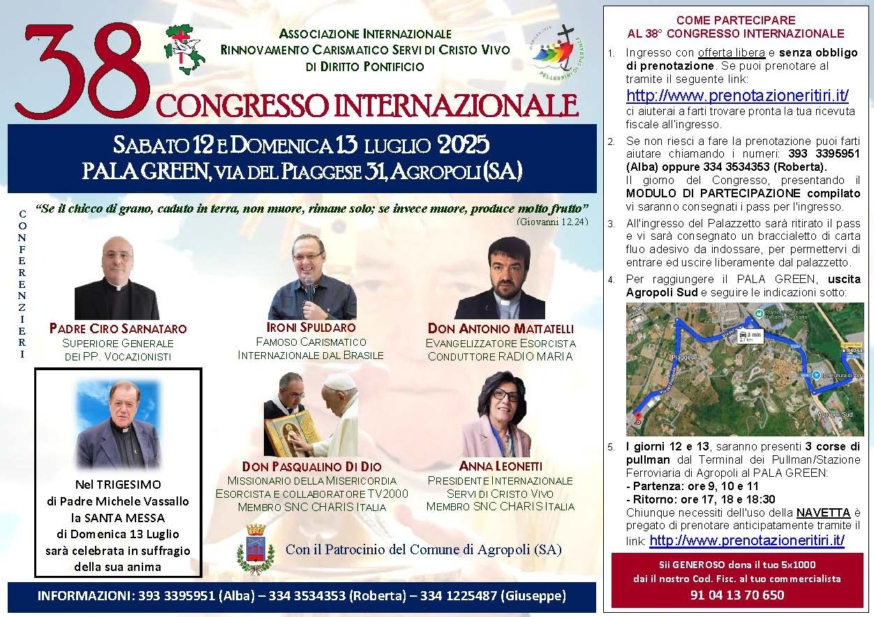 Agropoli. Sarà un congresso carico di emozioni, nel ricordo della scomparsa del fondatore dell’Associazione Internazionale Servi di Cristo Vivo di Diritto Pontificio, Padre Michele Vassallo, il raduno internazionale di preghiera dei Carismatici che si terrà sabato 12 e domenica 13 luglio 2025, a partire dalle ore 8.30, presso il Pala Green di Agropoli, nel Salernitano.