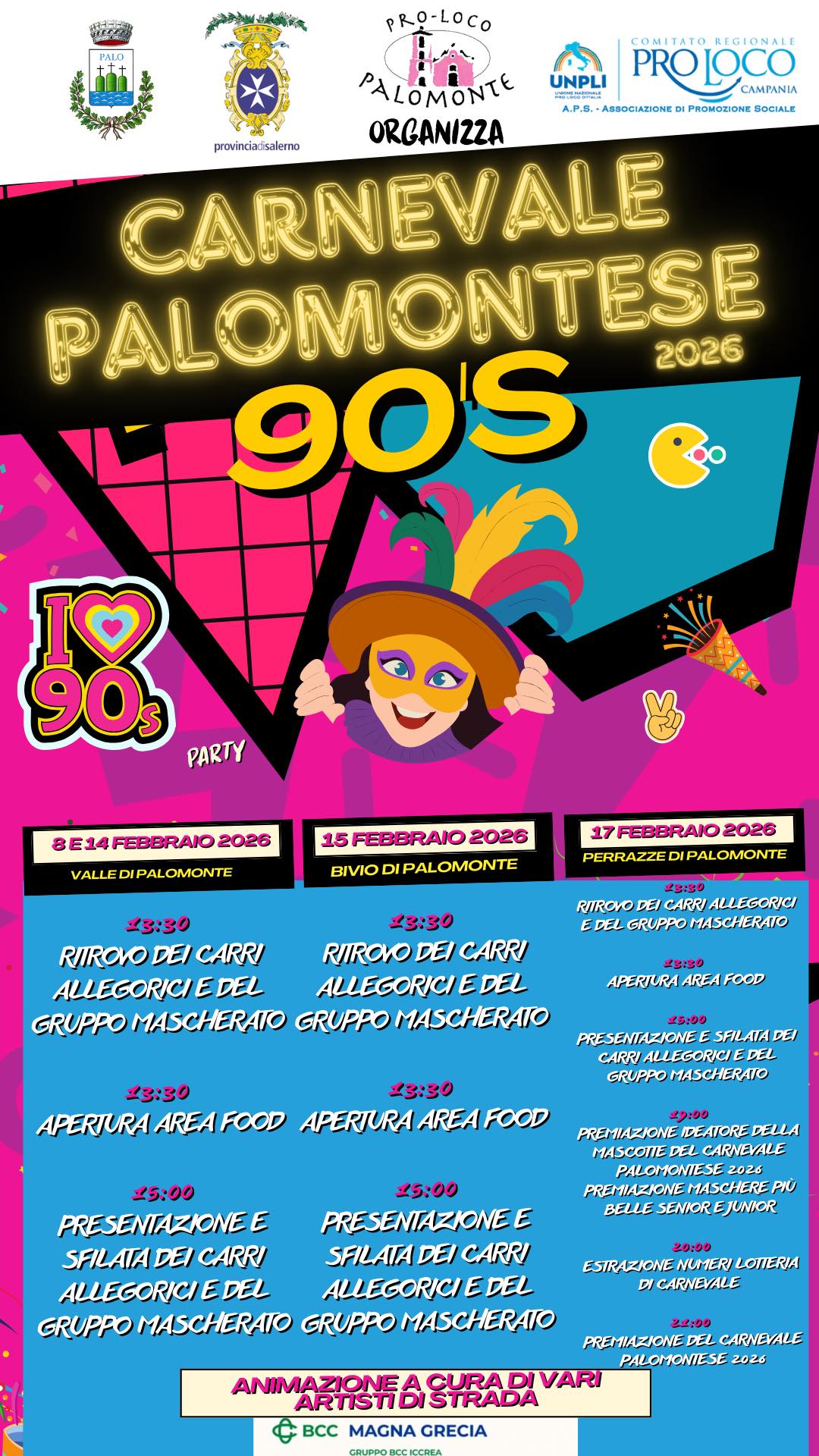 Prende il via domani, 8 febbraio, il Carnevale Palomontese 2026, uno degli appuntamenti carnevaleschi di maggiore rilievo dell’intera provincia, capace ogni anno di richiamare pubblico e visitatori da tutto il territorio. L’evento è promosso dalla Pro Loco Palomonte, grazie all’impegno dei volontari e al coinvolgimento dell’intera comunità.