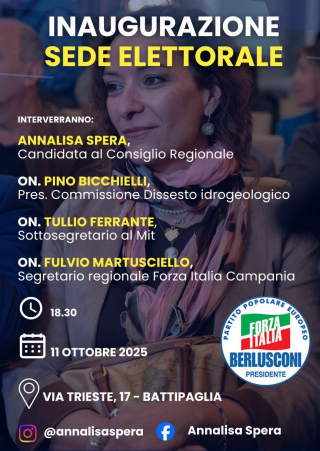 L’appuntamento elettorale del 23 e 24 novembre si avvicina e Annalisa Spera, candidata al Consiglio regionale nella lista di Forza Italia, inaugura il suo comitato a Battipaglia.