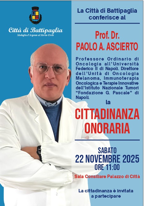 Sabato 22 Novembre, ore 11:00, all’interno dell’aula consiliare del Comune di Battipaglia, sarà conferita la Cittadinanza Onoraria a Paolo Antonio Ascierto, Professore Ordinario di Oncologia all’Università Federico II di Napoli, Direttore dell’Unità di Oncologia Melanoma, Immunoterapia Oncologica e Terapie Innovative dell’Istituto Nazionale Tumori “Fondazione G. Pascale” di Napoli.