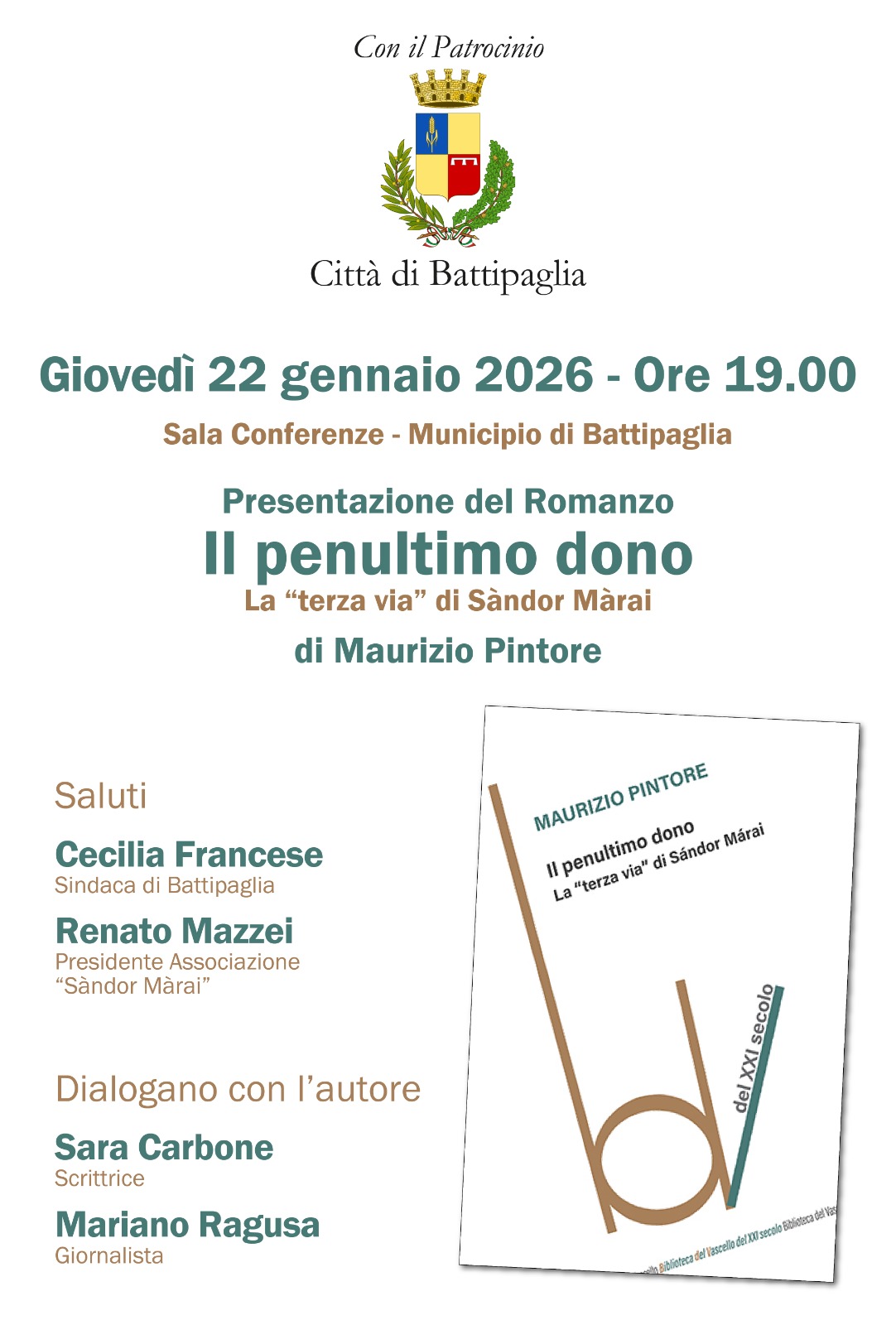 Giovedì 22 gennaio 2026, alle ore 19.00, la Sala Conferenze del Municipio di Battipaglia ospiterà la presentazione del romanzo “Il penultimo dono. La ‘terza via’ di Sándor Márai” di Maurizio Pintore, evento realizzato con il patrocinio della Città di Battipaglia.