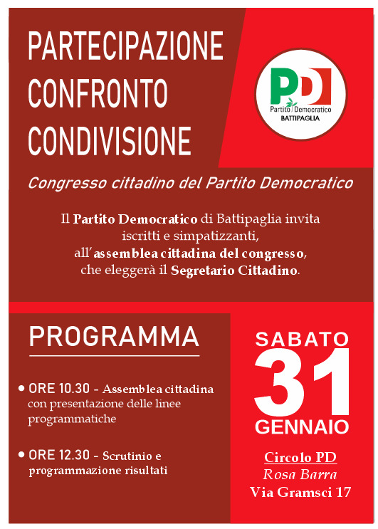 Il Partito democratico di Battipaglia convoca il Congresso cittadino per l’elezione del Segretario cittadino, un passaggio politico decisivo per il rilancio del ruolo del PD nella vita democratica e amministrativa della città.