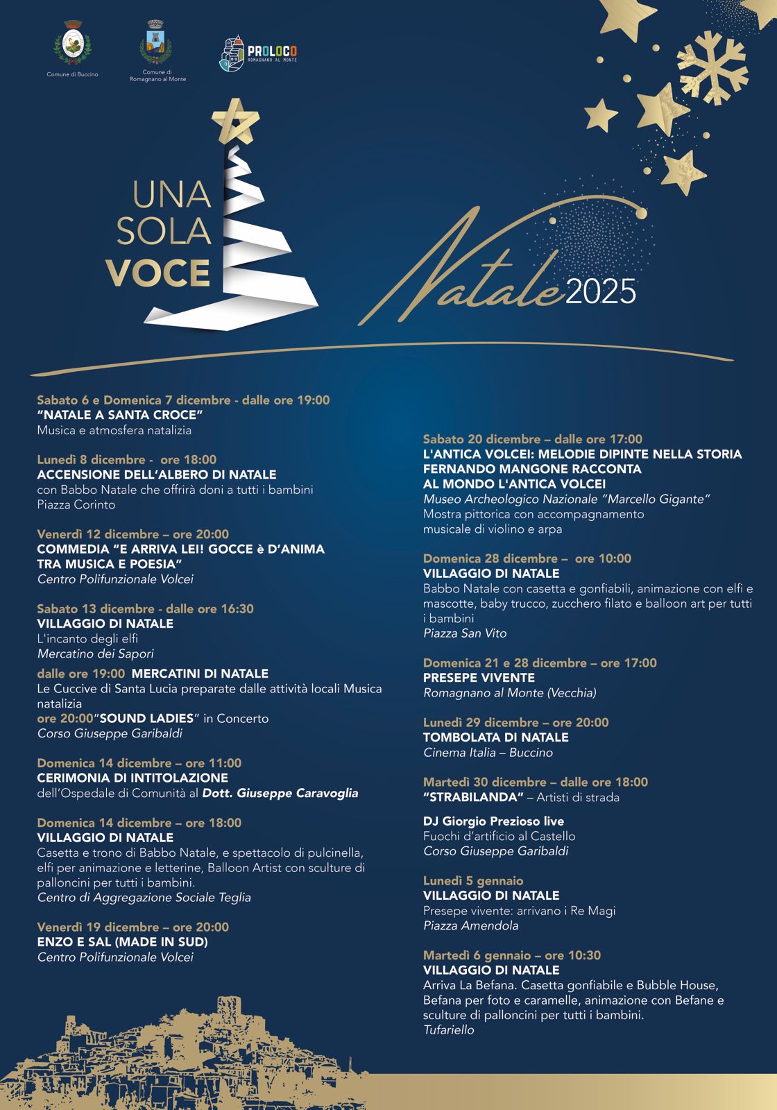 I Comuni di Buccino e Romagnano al Monte, in collaborazione con la Pro Loco di Romagnano al Monte, sono lieti di presentare il prosieguo del cartellone degli eventi “Natale 2025: Una Sola Voce”, che continuerà ad animare il territorio in un’atmosfera di musica, cultura e tradizione, a partire da domenica 14 dicembre fino all’Epifania.