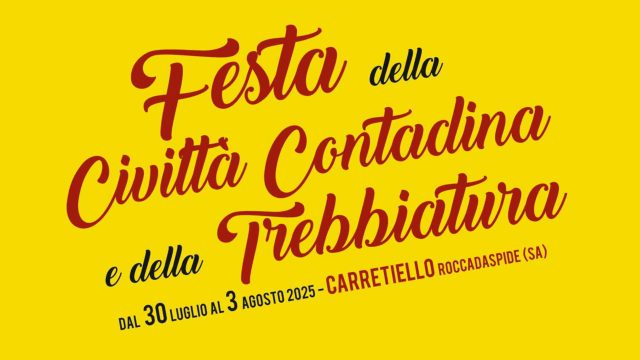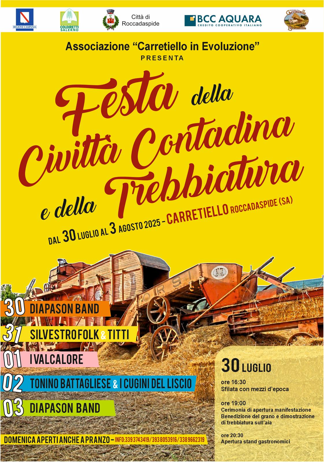 Con la mietitura entra nel vivo la preparazione della Festa della Trebbiatura e della Civiltà Contadina, in programma dal 30 luglio al 3 agosto nella frazione Carretiello di Roccadaspide. L’evento, promosso dall’associazione Carretiello in Evoluzione con i patrocini di Regione Campania, Comune di Roccadaspide, Coldiretti Salerno e Bcc Aquara, celebra la storia e le tradizioni delle famiglie contadine della Valle del Calore e della Piana del Sele.