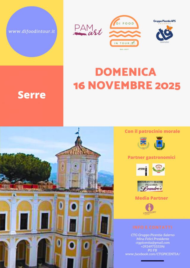 Domenica 16 novembre il Centro Turistico Giovanile Picentia di Salerno in collaborazione con lo Studio PAMart organizza una nuova tappa del progetto Di Food in Tour a Serre, un’esperienza guidata che unisce patrimonio storico, laboratori produttivi e sapori del territorio. L’iniziativa nasce con l’obiettivo di trasformare la visita di un borgo in un percorso sensoriale: «Di Food in Tour vuole far emergere il valore dei piccoli paesi — spiega Mina Felici, presidente del CTG Picentia — non come luoghi di passaggio, ma come comunità vive, dove architettura, memoria e produzione agroalimentare raccontano la storia di una regione». La giornata prenderà avvio alle ore 9:00 con l’arrivo in pullman GT e la visita guidata alla Casina Vanvitelliana, esempio di raffinata architettura borbonica posizionata in un contesto paesaggistico di grande fascino. La visita offrirà al pubblico non solo la lettura formale dell’edificio — elementi decorativi, rapporti spaziali e letture storico-artistiche — ma anche un’introduzione al contesto storico che ha generato queste infrastrutture.