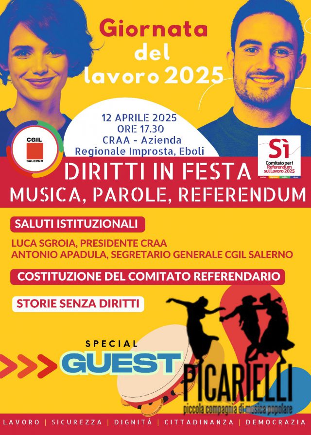 Sabato 12 aprile 2025, alle ore 17.30, presso il CRAA – Azienda Regionale Improsta di Eboli, si terrà “Diritti in festa. Musica, parole, referendum”, un appuntamento promosso dalla CGIL di Salerno in occasione della Giornata del Lavoro 2025.