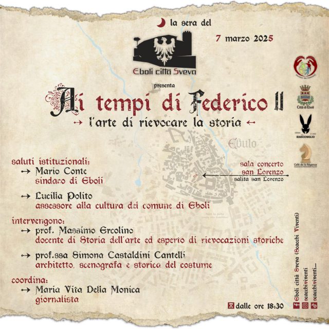 Dopo i saluti istituzionali del sindaco di Eboli Mario Conte e dell’assessore alla Cultura Lucilla Polito, i due esperti guideranno i presenti nell’affascinante universo dell’iconografia e dell’estetica medievale. Dalle parole ai “fatti”; dalla teoria alla pratica: nel corso della serata saranno, infatti, presentati anche quattro costumi d’epoca realizzati da artigiani specializzati, secondo i canoni propri dell’età federiciana.