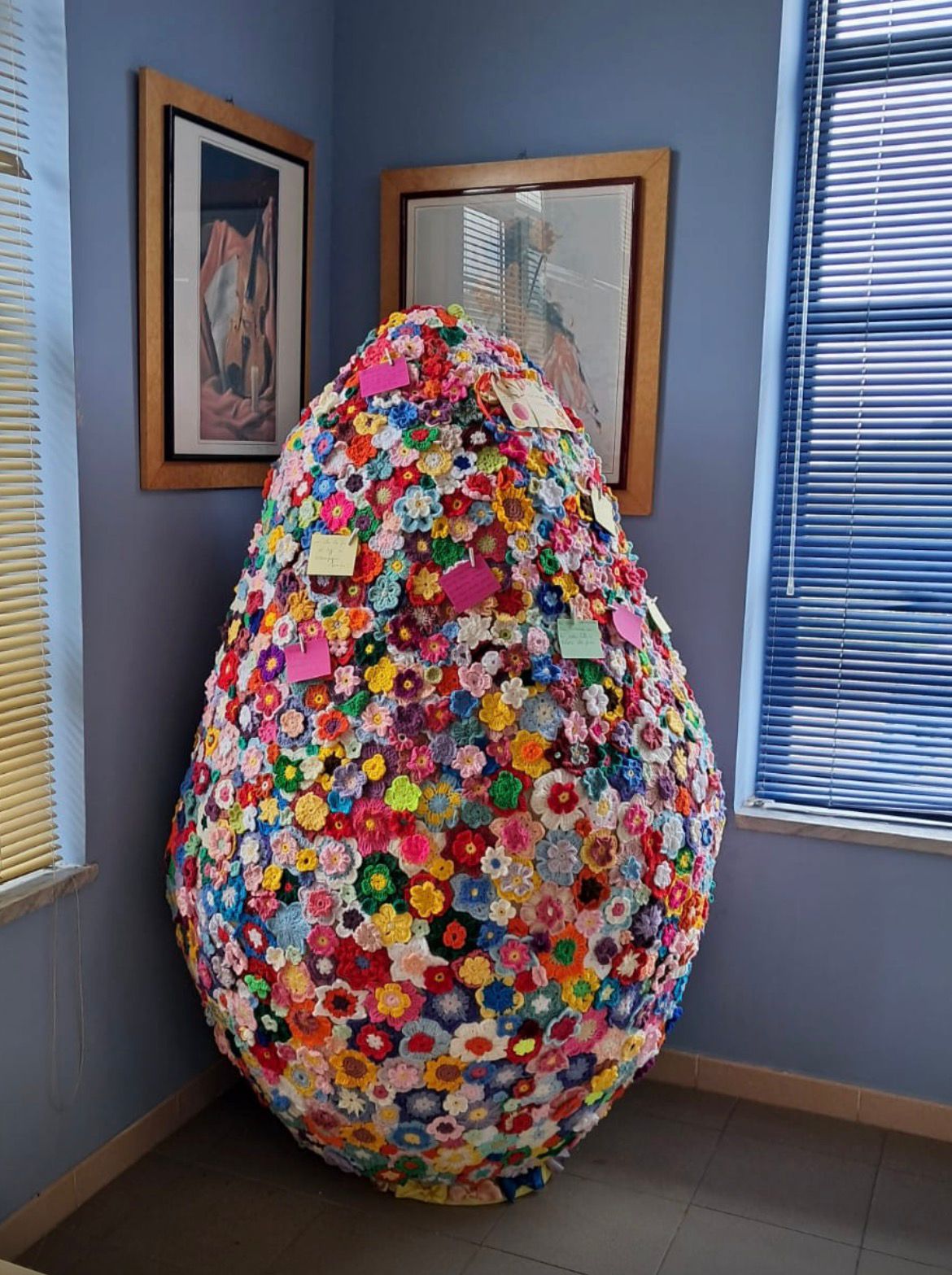 C’è un uovo di Pasqua che non si mangia, non si scarta e non si dimentica, è arrivato questa mattina all’Hospice Il Giardino dei Girasoli di Eboli: un uovo alto un metro e 63 centimetri, composto da 2.500 fiori realizzati a mano. E’ il dono del Gruppo Uncinetto Rosa dell’associazione Noi Amici dell’Hospice e dell’Ospedale di Eboli, un’opera collettiva, costruita filo dopo filo, grazie a chi ha donato la lana, a chi ha intrecciato i fiori e a chi, come le Uncinettine di Lorylù di Altavilla Silentina, ha reso possibile un lavoro tanto imponente quanto simbolico.