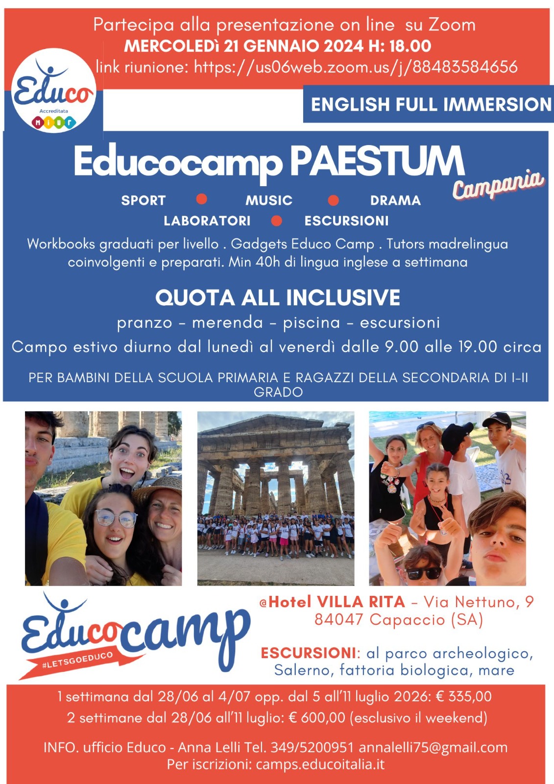 Per l’estate 2026 il Centro Trinity College London 69643 “Antonella Maraio’s Language School”, diretto da Antonella Maraio, in collaborazione con Educo Italia, ente accreditato MIUR, organizza Educocamp Paestum, un camp estivo in lingua inglese che si svolgerà presso l’Hotel Villa Rita.