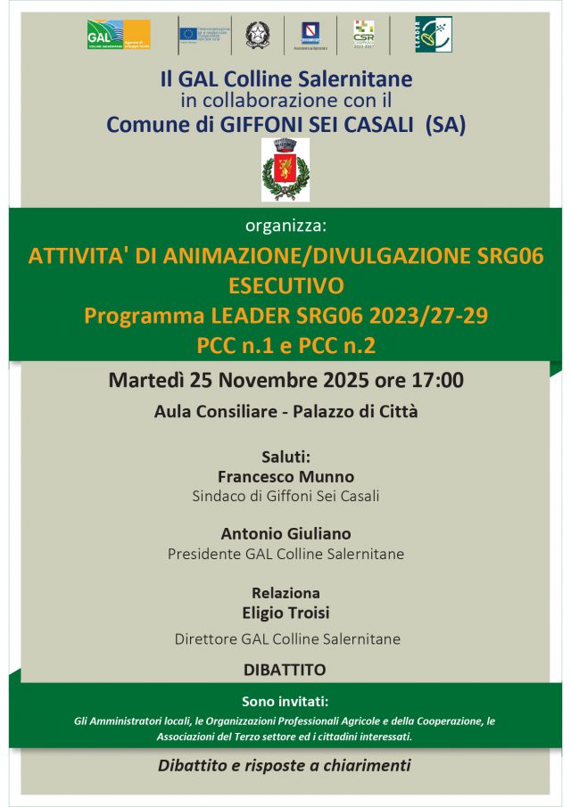 Le attività prenderanno il via martedì 25 novembre, alle ore 17:00, presso l’Aula Consiliare del Comune di Giffoni Sei Casali, con la partecipazione del Sindaco Francesco Munno e del Presidente del GAL Antonio Giuliano.