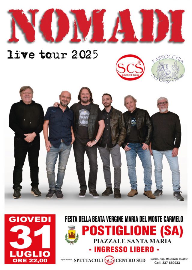 I Nomadi, con brani intramontabili come “Io vagabondo”, “Dio è morto” e “Noi non ci saremo”, porteranno a Postiglione tutta la forza evocativa della loro musica, capace di unire generazioni nel segno dell’impegno, della memoria e dell’emozione.