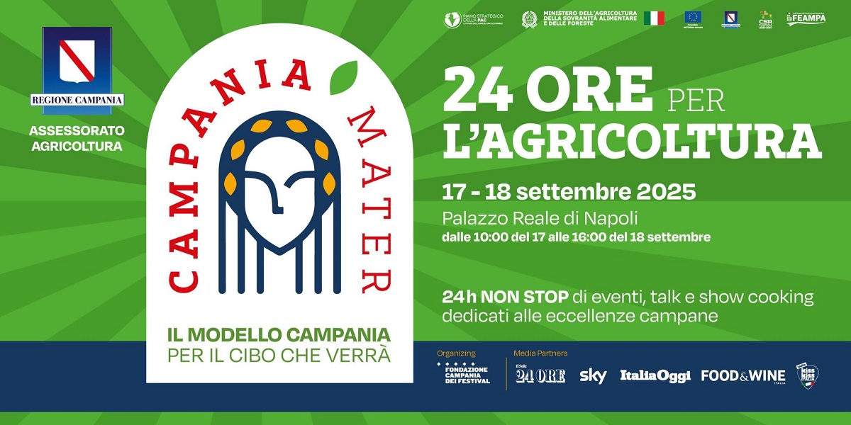 L’evento “Campania Mater – 24 ore per l’Agricoltura”, promosso dall’Assessorato all’Agricoltura della Regione Campania, guidato dall’On. Nicola Caputo, si terrà presso il Teatro di Corte del Palazzo Reale di Napoli dal 17 al 18 settembre 2025.