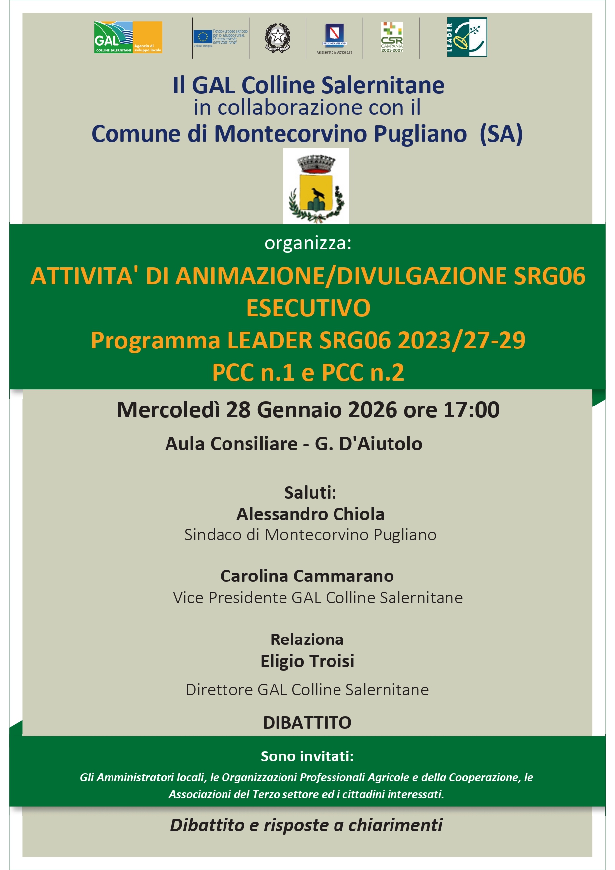 Sarà il Sindaco di Montecorvino Pugliano, Alessandro Chiola ad ospitare il settimo incontro di Animazione Territoriale, organizzato dal GAL Colline Salernitane, per mercoledì 28 gennaio 2026, presso l’Aula consiliare “G. D’Aiutolo”, a partire dalle ore 17:00, per presentare la Strategia RSG06 – programmazione 2023/27-29, per la costituzione delle Associazioni di Scopo, per l’attuazione dei due Progetti Complessi di Comunità: PCC n.1“Risorse forestali e idriche per una economia circolare e sostenibile”, finalizzato alla valorizzazione del patrimonio agricola, Ambientale, naturale, forestale e delle acque, nell’ottica della transizione ecologica e dell’uso efficiente delle risorse e PCC n.2 “Agroalimentare di qualità per un’offerta turistica coerente e competitiva”, che punta a rafforzare l’identità agricola, agroalimentare ed enogastronomica del territorio, sostenendo le filiere locali e promuovendo un turismo lento e rigenerativo legato ai prodotti di qualità del Territorio; nonché alle modalità di costituzione dell’Assemblea di Comunità.