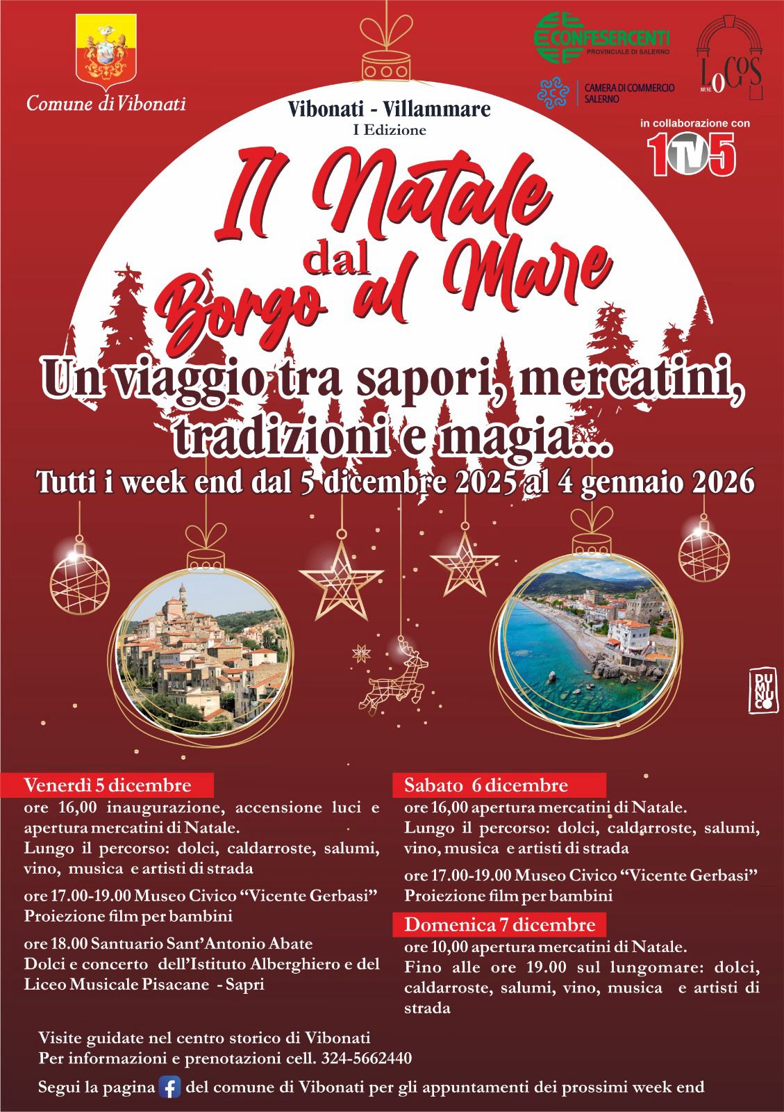 Il Comune di Vibonati, in collaborazione con 105 TV e il Museo Logos, presenta con entusiasmo la prima edizione dei mercatini natalizi “Il Natale dal Borgo al Mare”. Un evento diffuso che unisce la magia del borgo antico di Vibonati al fascino marinaro di Villammare, creando un percorso suggestivo fatto di luci, tradizioni e atmosfera festiva.