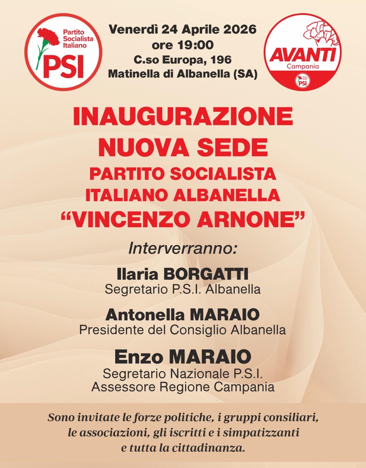 Venerdì 24 aprile 2026, alle ore 19:00, in Corso Europa a Matinella di Albanella, si terrà l’inaugurazione della nuova sede del Partito Socialista Italiano, intitolata a Vincenzo Arnone.