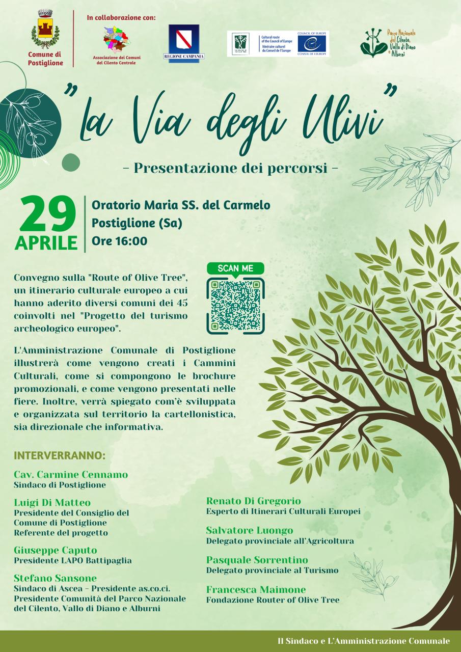Con queste parole il sindaco di Postiglione, Carmine Cennamo, annuncia la presentazione ufficiale del progetto europeo dei percorsi de “La Via degli Ulivi”, in programma martedì 29 aprile 2025 a partire dalle ore 16:00 presso l’Oratorio Parrocchiale Maria Santissima del Carmelo di Postiglione.