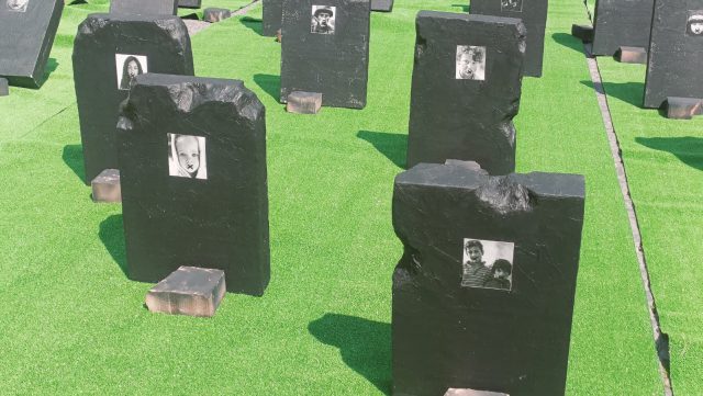 L’opera è composta da numerose sagome nere, disposte in modo ordinato e simili a lapidi, sulle quali sono raffigurate immagini di volti. L’insieme richiama chiaramente un simbolismo legato alla memoria, alla perdita e al lutto collettivo. L’assenza di firme, simboli distintivi o rivendicazioni ufficiali contribuisce a rendere l’installazione ancora più enigmatica, lasciando spazio a diverse letture da parte dell’opinione pubblica.