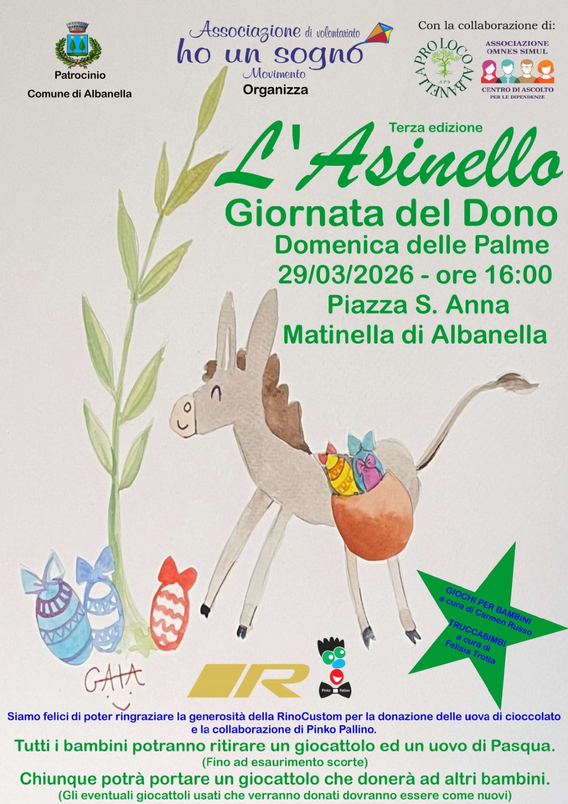 Un ringraziamento speciale va alla RinoCustom di Rino Acito, che anche quest’anno ha donato le uova di Pasqua di cioccolato da distribuire ai bambini partecipanti.