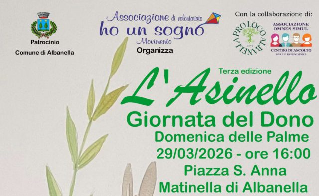 Domenica 29 marzo 2026, in occasione della Domenica delle Palme, torna a Matinella di Albanella la terza edizione de “L’Asinello – Giornata del Dono”, iniziativa solidale dedicata ai più piccoli e alle famiglie del territorio.