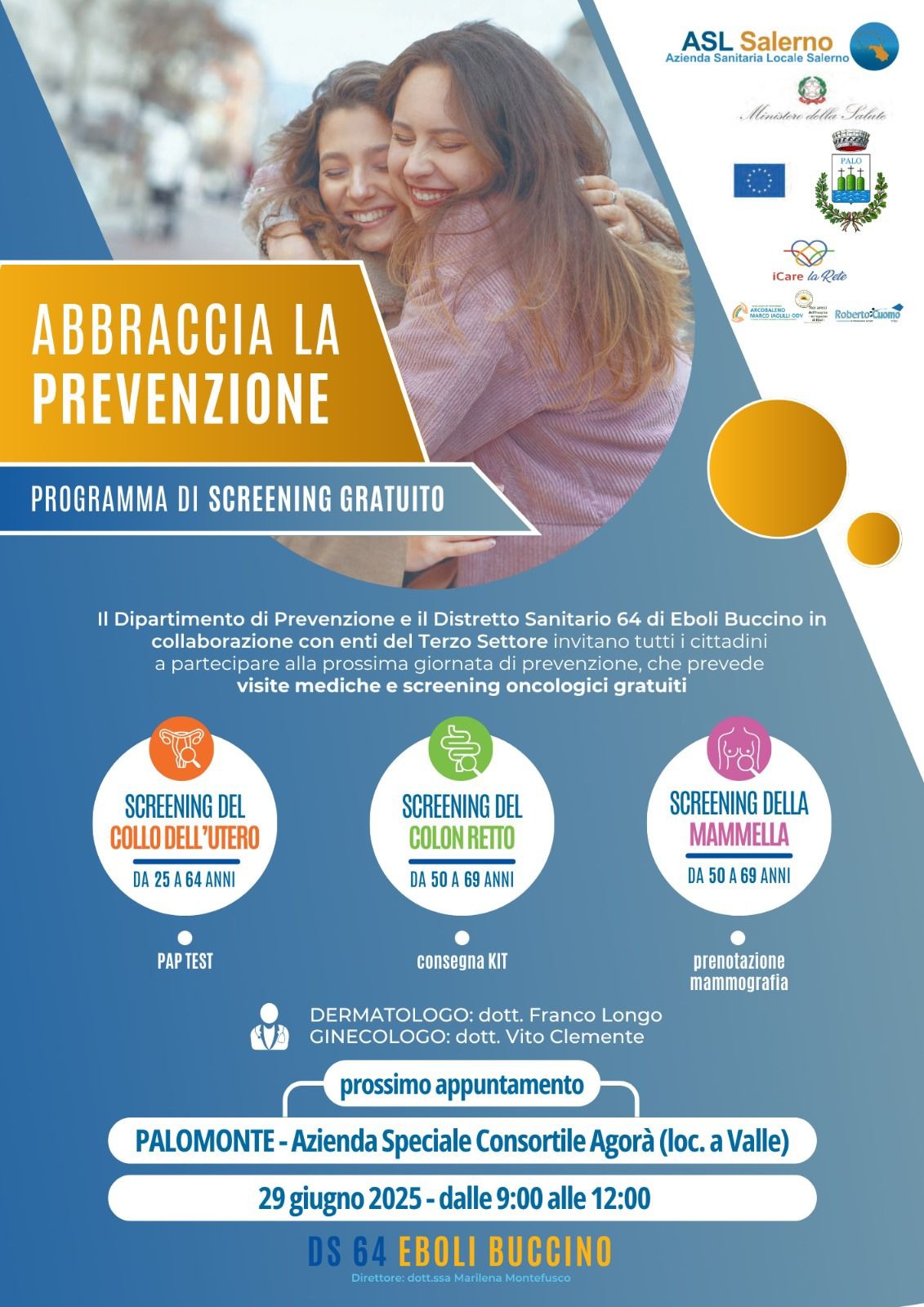 Palomonte – Una giornata di visite gratuite con screening finalizzati alla prevenzione dei tumori al colon retto, al collo dell’utero e alla mammella. Grazie alla sinergia tra l’Assessorato alle Politiche Sociali del Comune di Palomonte, guidato dall’assessore Anna Annunziata Massa, e l’ASL di Salerno, arriva nell’Alta Valle del Sele la carovana dell’ASL con una giornata dedicata alla prevenzione oncologica.