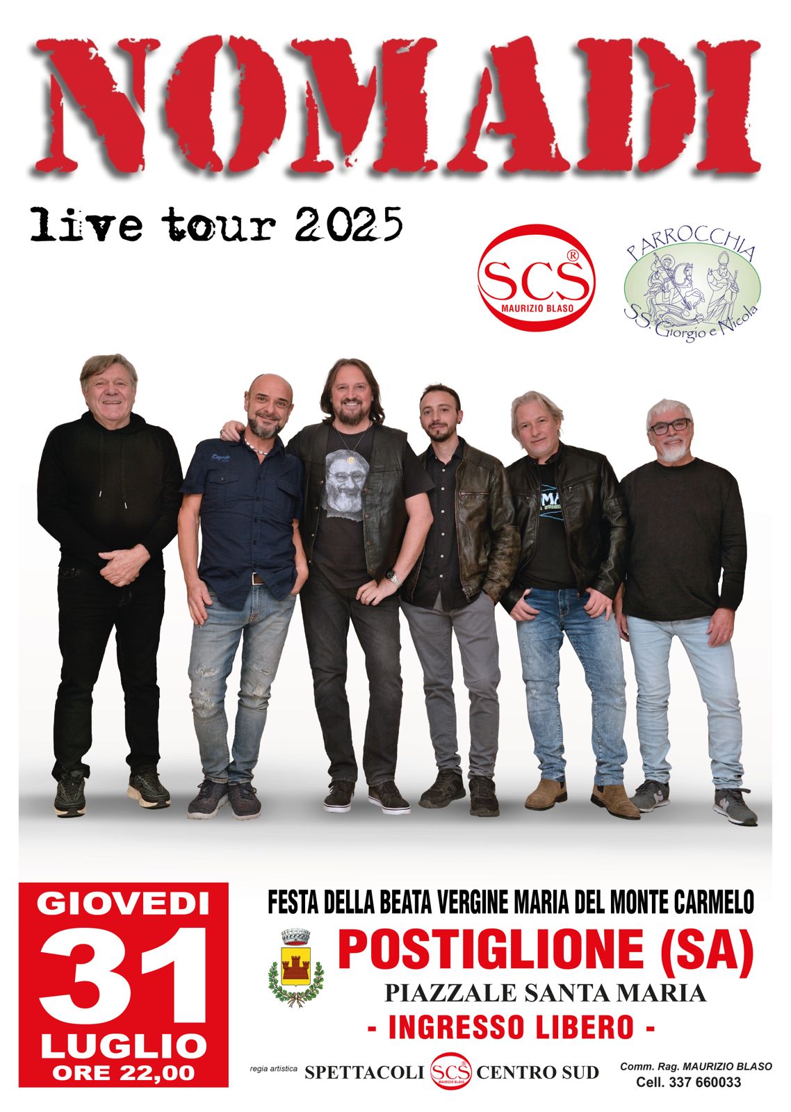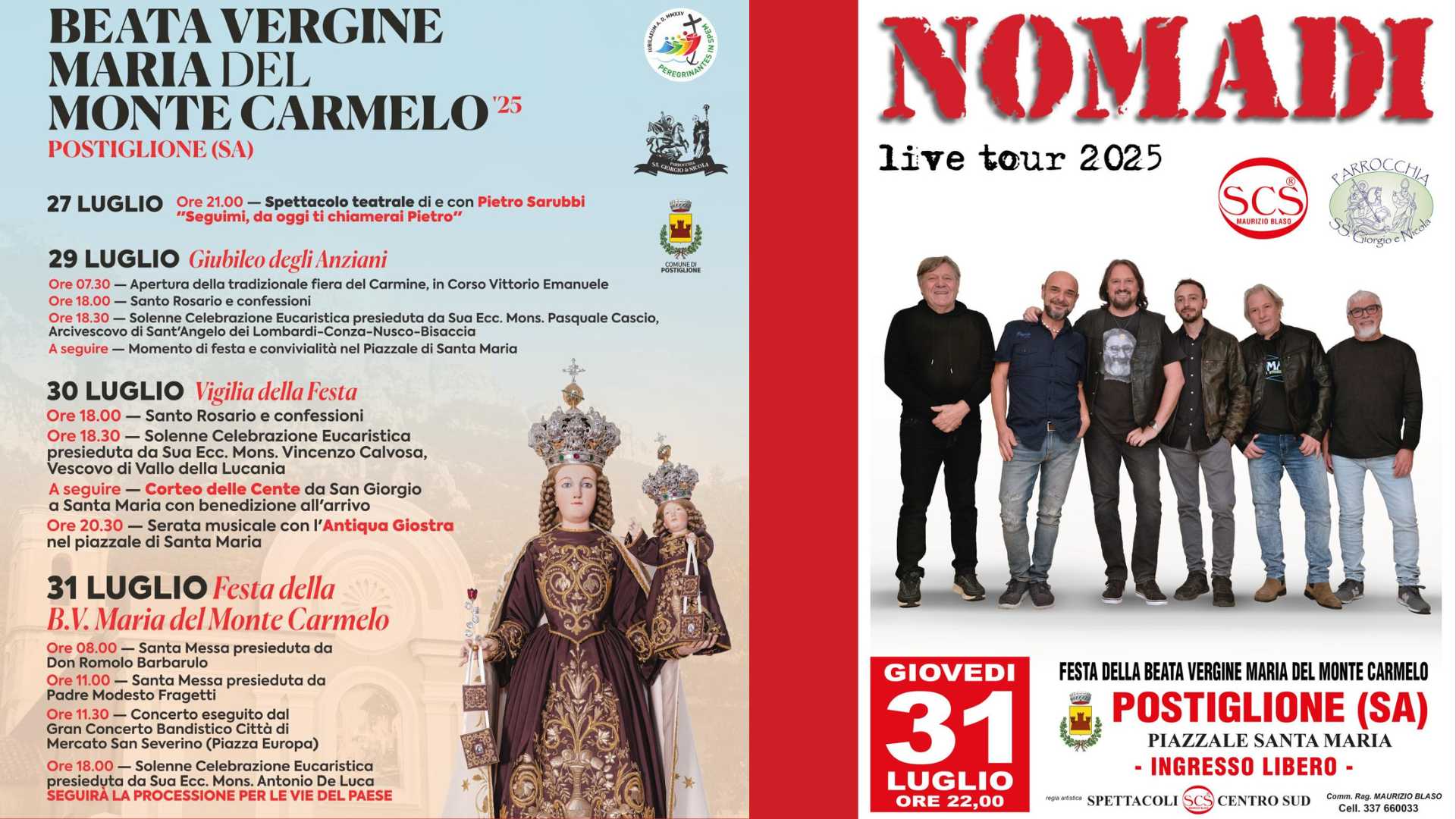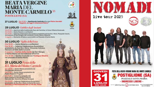 Postiglione: “Un viaggio alla riscoperta della fede, delle antiche tradizioni, del teatro, della natura e della grande musica italiana”. Annuncia così Don Martino De Pasquale, parroco della cittadina di Postiglione, nel salernitano, la festività in onore della Madonna del Carmelo, patrona della città alburnina e che vede l’intero paese in fermento per il grande evento che si svolgerà dal 27 al 31 luglio nel centro abitato di Postiglione alla presenza di ben tre vescovi italiani e del concerto di musica live con ingresso gratuito de i Nomadi.