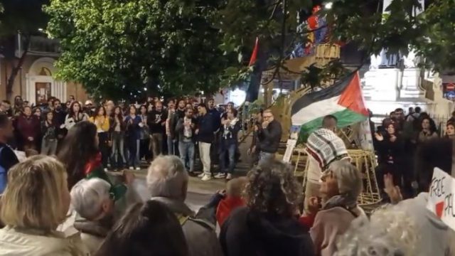 A Salerno ieri sera si è svolta una manifestazione pro Palestina a sostegno della Flotilla, bloccata dalla Marina israeliana a 100 miglia da Gaza, con un presidio soprattutto di giovani dinanzi la stazione ferroviaria.