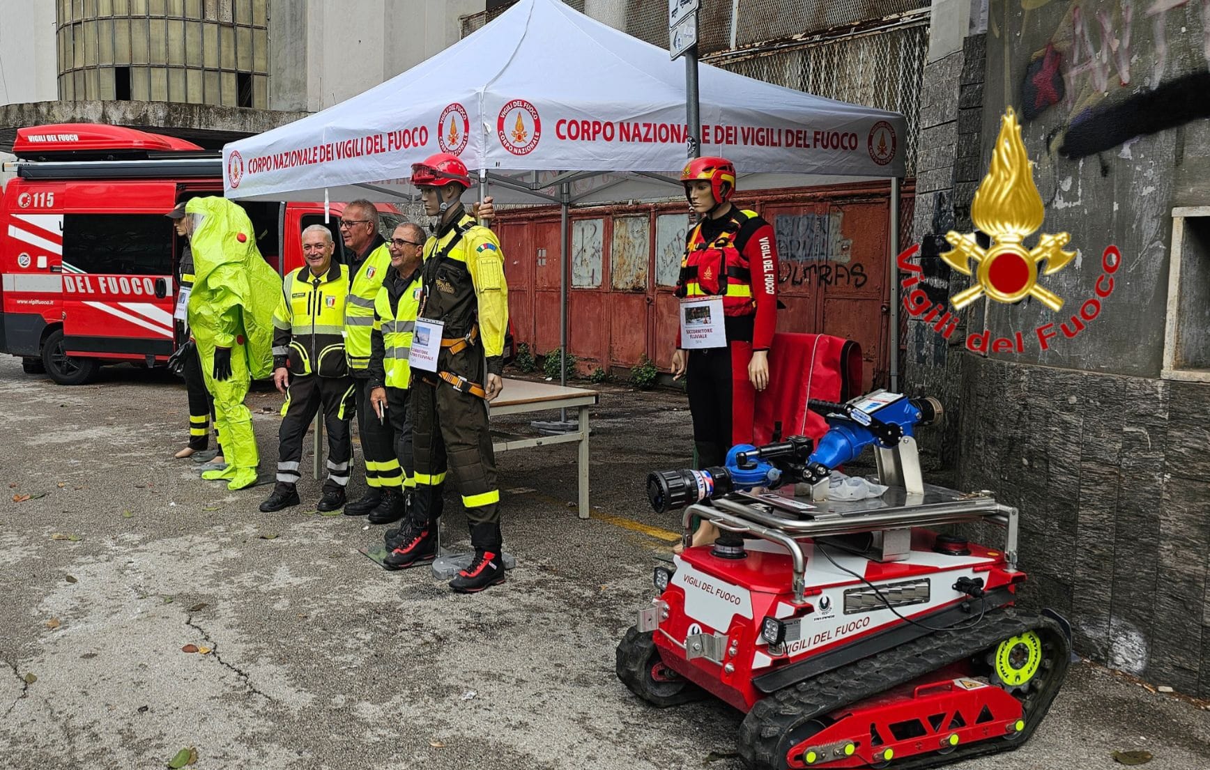 Il Comando dei Vigili del Fuoco di Salerno ha partecipato con funzionari di guardia, squadre TAS II Livello, personale USAR, piloti di droni, nucleo SAF e un’autoscala. La simulazione ha incluso il recupero di persone sotto le macerie e il salvataggio di un malcapitato dal tetto di un edificio tramite barella Toboga, consegnato poi alle cure del personale sanitario.