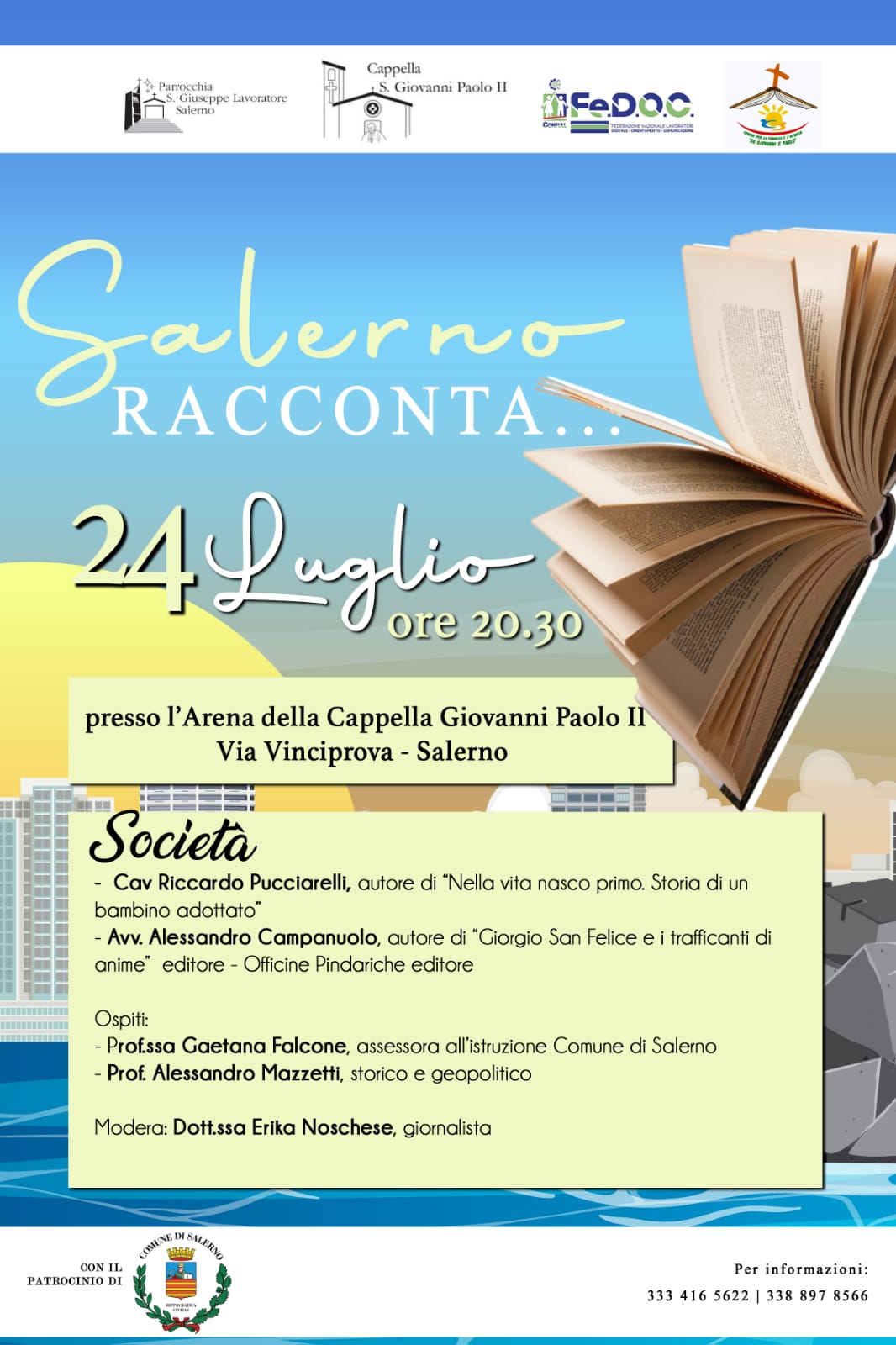 Sul palco, a partire dalle 20 e 30, scrittori salernitani si confronteranno con ospiti rappresentanti delle istituzioni, della società civile ,del mondo della formazione, rappresentanti sindacali e delle associazioni di categoria.