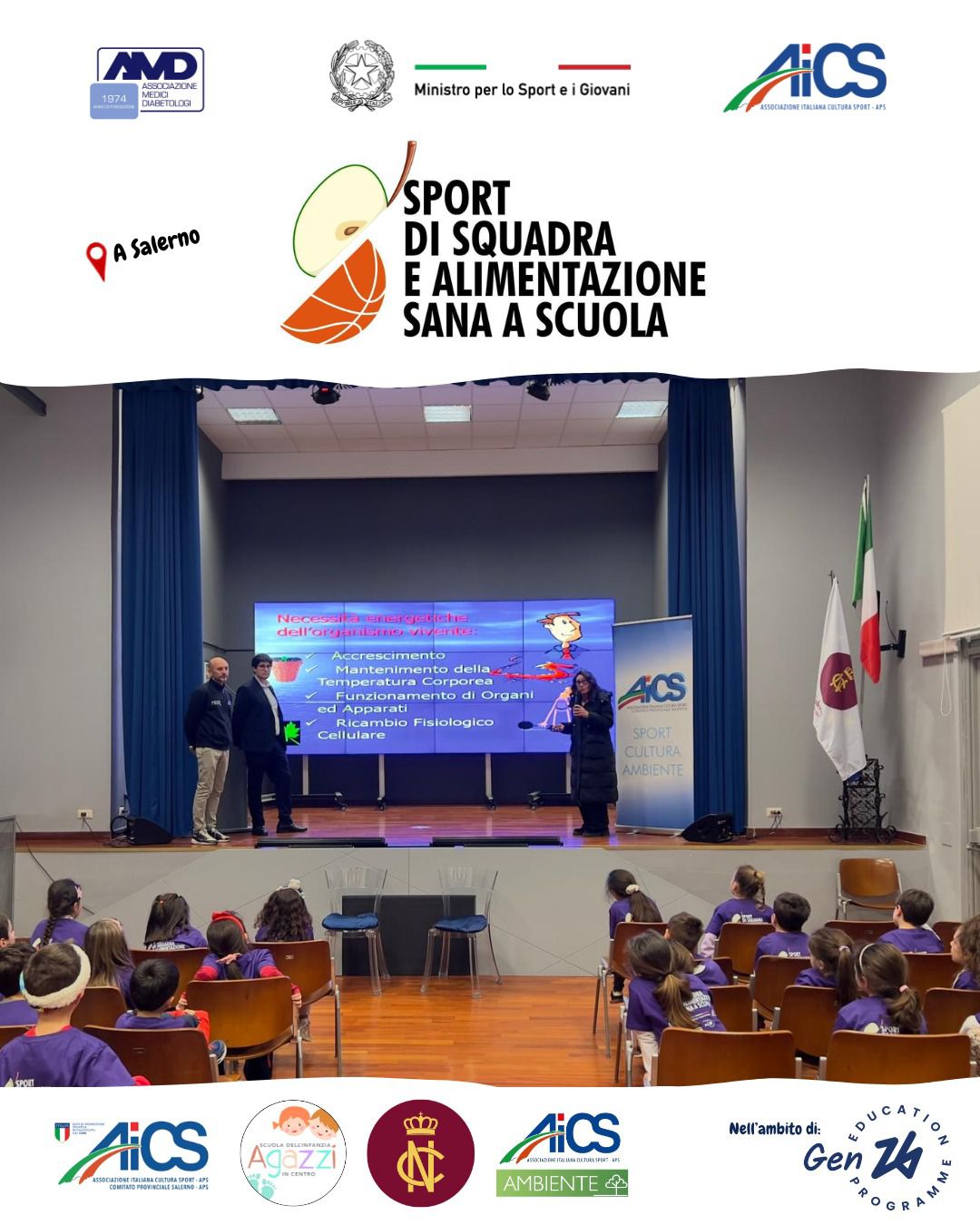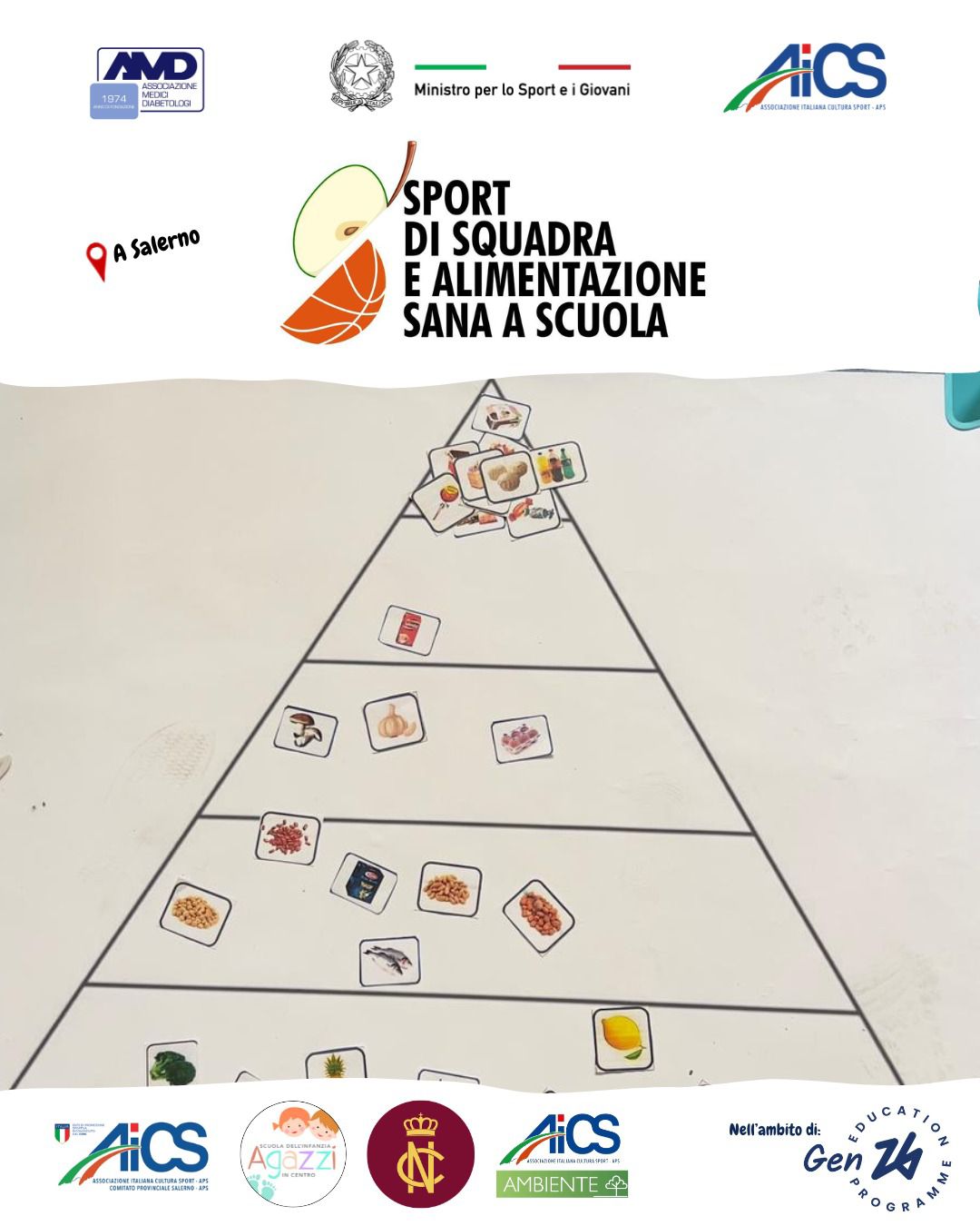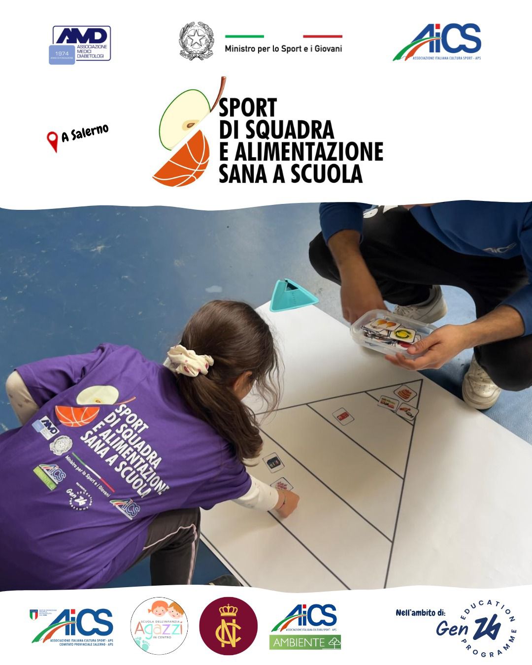 L’evento rientra nel progetto Sport di squadra e alimentazione sana a scuola promosso da AiCS Direzione Nazionale, in collaborazione con l’Associazione medici diabetologi e con il supporto finanziario del Ministro per lo Sport e i Giovani attraverso il Dipartimento Sport della Presidenza del Consiglio dei Ministri. Nel territorio di Salerno, vi partecipano la scuola dell’infanzia Agazzi e il Convitto Nazionale Torquato Tasso.