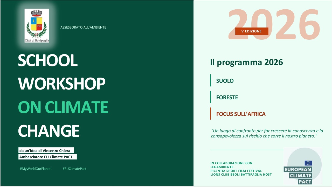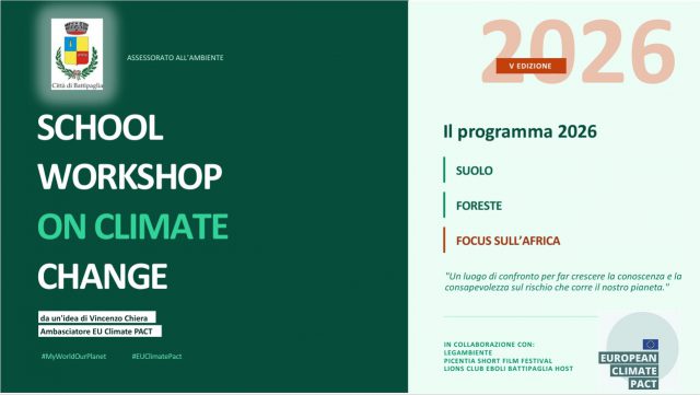 Torna lo School Workshop on Climate Change, l’iniziativa dedicata alla formazione e sensibilizzazione ambientale delle giovani generazioni, giunta alla quinta edizione. Il progetto nasce da un’idea di Vincenzo Chiera, neo Ambasciatore per il Patto per il Clima, ed è promosso e sostenuto dal neo assessore all’Ambiente Pietro Cerullo, che ne riconosce la forte valenza educativa per gli studenti di Battipaglia.